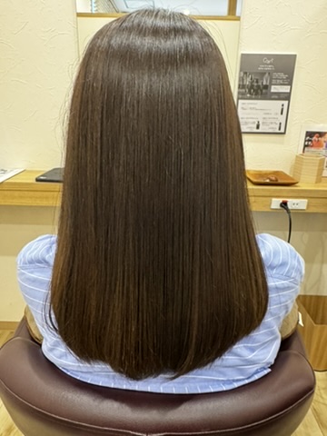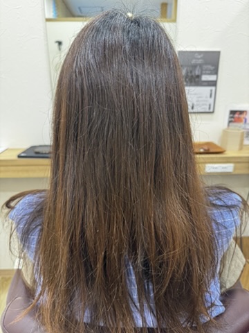 こちらが仕上がりの写真になります。ヘアカラーも綺麗に染まり、ムラが消えていますね。手触りもするするっとシルクのような仕上がりになりました。
